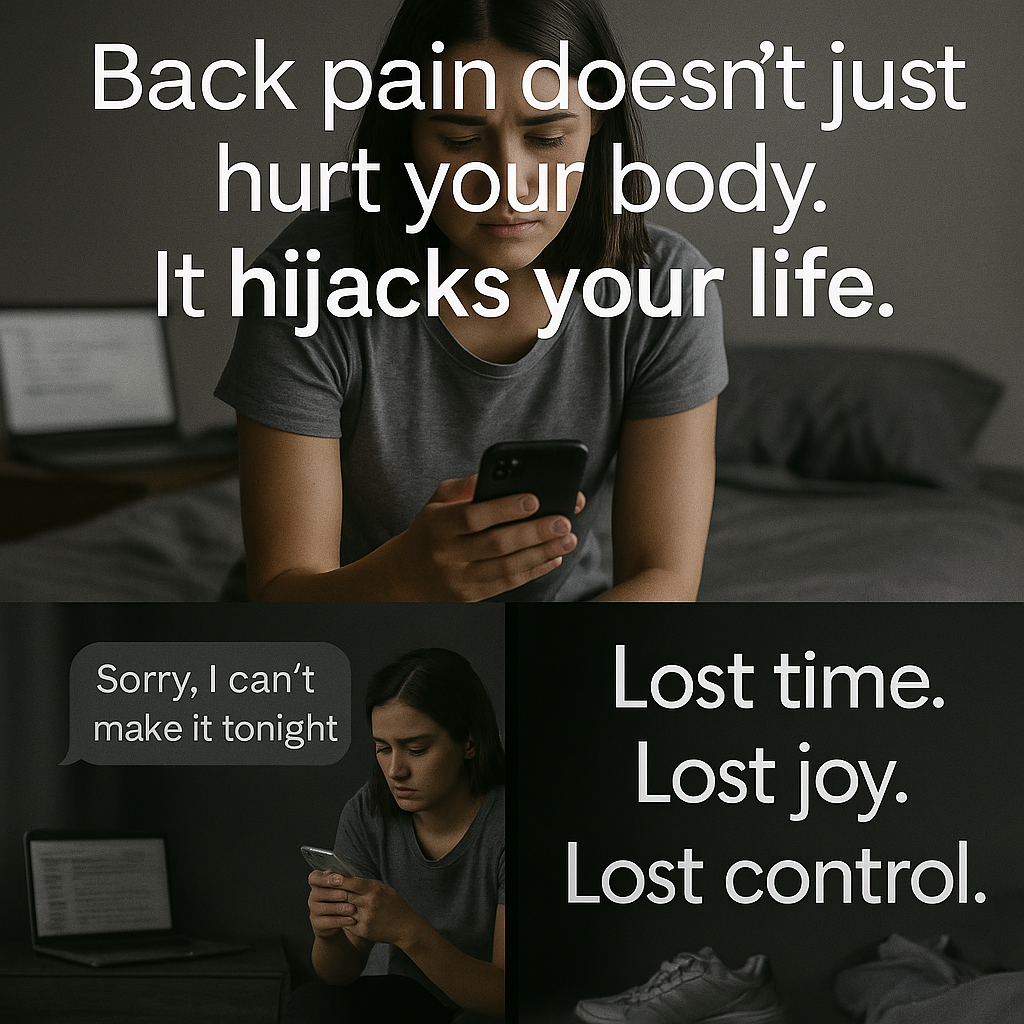 Because back pain isn’t just pain.It’s a downward spiral that slowly ruins everything: You train less.